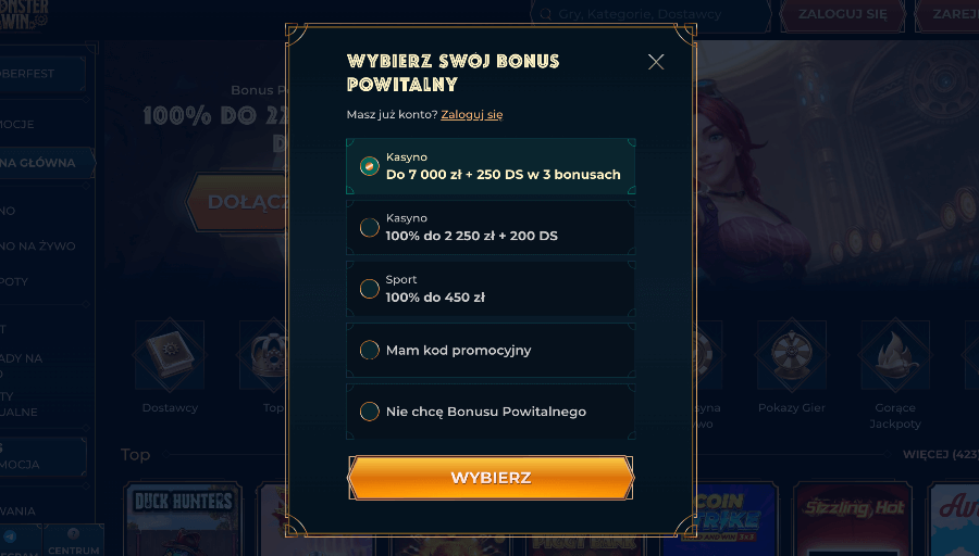 - Bonusy proponowane w Monsterwin